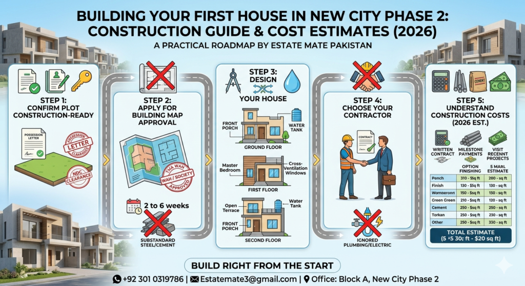 Title: Building Your First House in New City Phase 2: Construction Guide & Cost Estimates (2026) URL Slug: /building-house-new-city-phase-2-construction-guide Focus Keyword: building house New City Phase 2 Meta Description: Planning to build on your plot in New City Phase 2 Wah Cantt? Estate Mate’s 2026 construction guide covers costs, timelines, building map applications, and practical […]