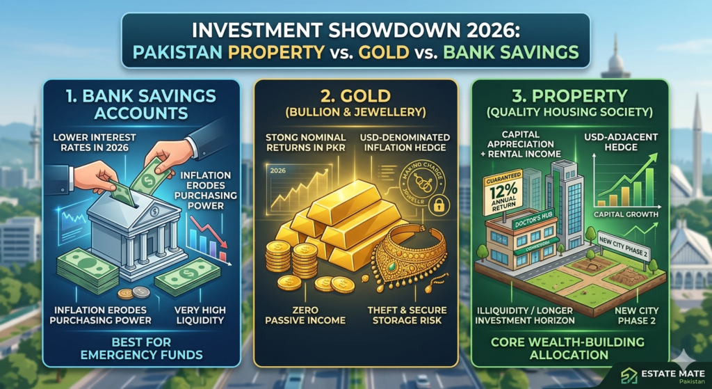 Pakistan Real Estate Investment vs. Gold vs. Bank Savings: What Wins in 2026?